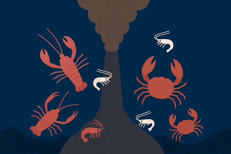 深海底には、地球内部のマグマで熱せられた300℃〜400℃もの熱水が噴き出す「熱水噴出孔(チムニー)」と呼ばれる場所があります。太陽光は届きませんが、熱水に含まれる硫化水素やメタンなどの化学物質をエネルギー源とするバクテリアが繁殖し、それを食べるエビやカニ、貝類などが集まる、独自の生態系が形成されています。生命の起源の場所とも目される、神秘的なオアシスです。