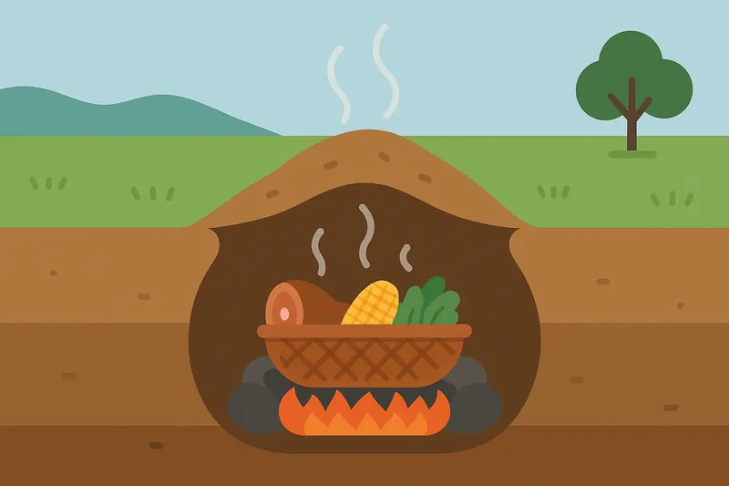 ニュージーランドの先住民マオリ族の伝統料理「ハンギ」。これは地面に穴を掘り、焼けた石を底に敷き詰め、その上に肉や野菜を入れたカゴを置いて土を被せ、数時間かけて蒸し焼きにする豪快な料理です。地熱と蒸気でじっくり加熱された食材は、スモーキーな香りと素材本来の旨味が凝縮されています。冠婚葬祭や特別な集まりで振る舞われるお祝いの味です。