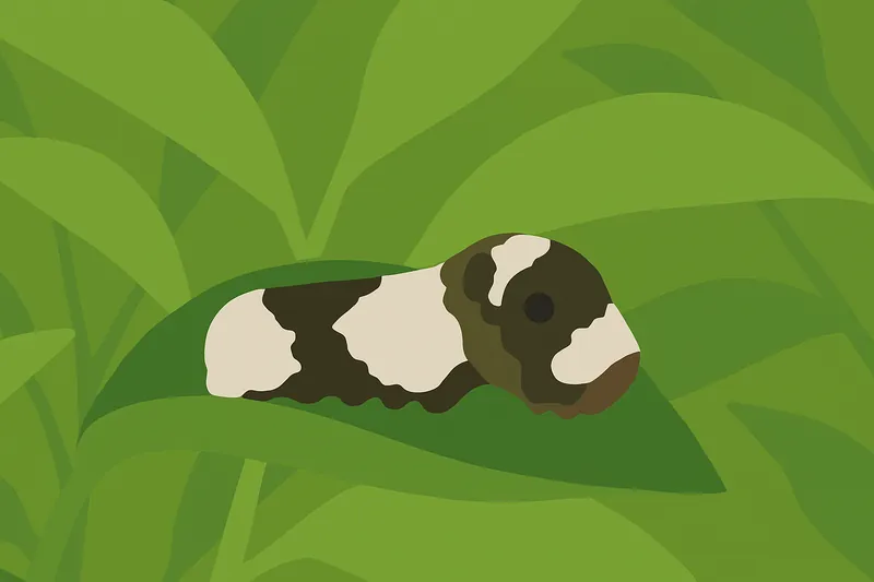 ナミアゲハの幼虫は、孵化してからしばらくの間(1齢〜4齢)、黒っぽい体に白い模様が入った姿をしています。これはどう見ても「鳥のフン」そのものです。多くの捕食者である鳥にとって、自分たちの排泄物は食べ物として認識対象外です。あえて汚いものや価値のないものに化けることで、敵の目を欺いているのです。なお、大きく成長して食べる量が増えると、今度は緑色の葉っぱに紛れる保護色へと変身(脱皮)します。