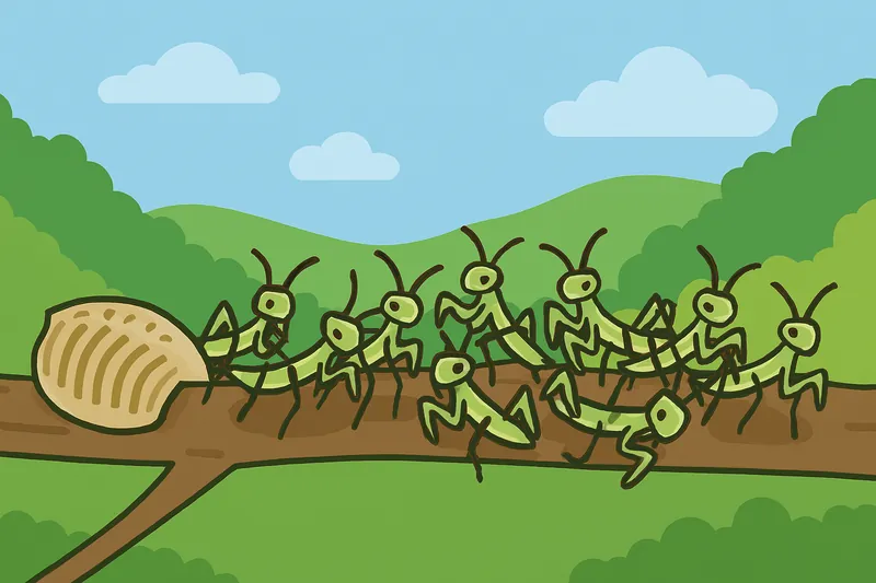カマキリの幼虫は、ひとつの卵鞘(らんしょう)から数百匹が一斉に孵化しますが、生まれた瞬間から過酷な生存競争に晒されます。彼らは生まれつき肉食で、親からの世話も受けず自力で狩りをしなければなりません。そのため、体の小さなアブラムシなどを捕まえられない場合、手近にいる「生まれたばかりの兄弟」を共食いして栄養を補給することがあります。成虫になれるのはごく一部という、自然界の厳しさを象徴する生態です。