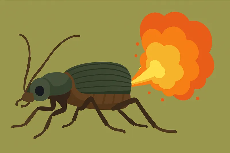 「屁っぴり虫」の異名を持つミイデラゴミムシは、体内で高度な化学実験を行っています。敵に襲われると、腹部の貯蔵庫にある過酸化水素とヒドロキノンという化学物質を反応室で混合し、酵素の働きで爆発的な化学反応を起こします。これにより生成された100℃以上の高温かつ刺激臭のあるガスを、「プッ」という爆発音と共に噴射します。このガス攻撃はカエルや鳥の口の中すら火傷させる威力があり、捕食者から逃れるための強力な武器です。