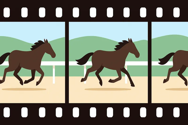 1878年、写真家エドワード・マイブリッジは「走る馬の足は全て地面から離れる瞬間があるか」という論争に決着をつけるため、カリフォルニアで実験を行いました。彼はコースに24台のカメラを並べ、馬が通過すると糸が切れてシャッターが下りる仕組みを考案。この連続写真は、静止画の連なりが動画になることを科学的に証明し、後の映画用カメラ(キネトグラフ等)の発明へとつながる決定的な一歩となりました。