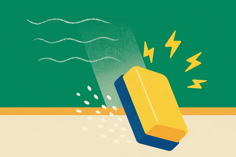 黒板消し(ラーフル)で黒板を拭くとき、実は静電気が発生しています。通常、静電気は嫌われものですが、黒板消しの場合は、この静電気がチョークの粉を繊維の奥に吸着させる役割を果たしています。もし静電気が起きにくい素材だと、拭いたそばから粉がパラパラと落ちてしまい、教室中が粉だらけになってしまいます。きれいに消せるのは、繊維とチョークの相性を考えた科学の力なのです。