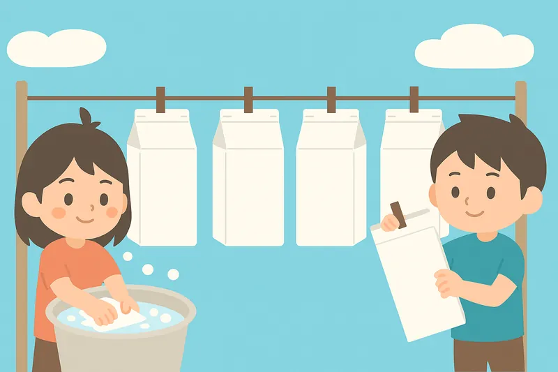 食後に牛乳パックを平らに開く作業、懐かしいですよね。これは単にゴミの体積を減らすだけでなく、高品質なトイレットペーパーなどにリサイクルするために必須の工程です。内側の薄いフィルム(ポリエチレン)と紙を分離するには、工場で溶かす工程が必要ですが、汚れやカビがついていると再生できません。子どもたちがきれいに洗って開いて乾かすことで、初めて資源として生まれ変わるのです。