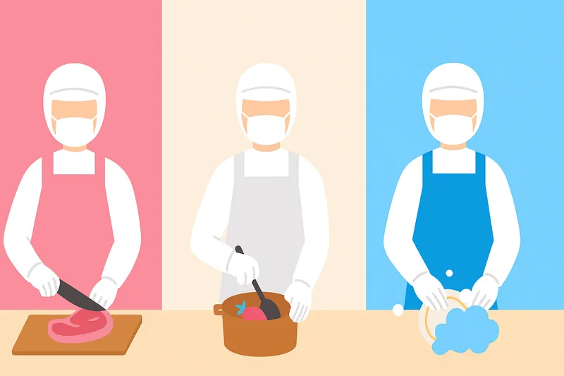 給食センターでは、食中毒を防ぐために徹底した衛生管理が行われています。その一つがエプロンの色分けです。「汚染作業区域(肉や魚の下処理)」はピンク、「非汚染作業区域(加熱調理)」は白、「洗浄区域」は青など、担当エリアごとに色を変えています。これにより、生肉を触った人がそのまま調理エリアに入ってしまうようなミスを視覚的に防ぎ、菌の交差汚染をブロックしています。